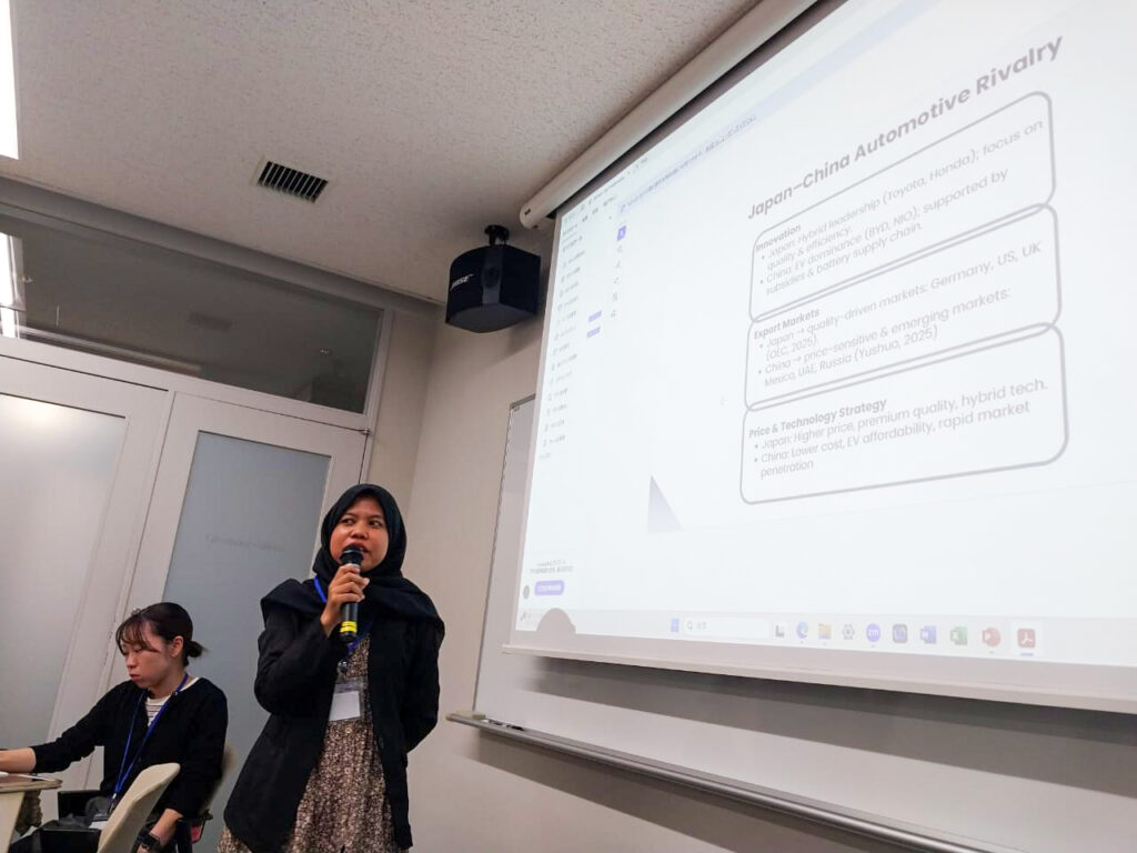 Dalam pemaparannya yang berjudul “Rivalry and Interdependence in the East Asian Automotive Industry: The Power Dynamics between Japan and China,” Diah Ayu Wulandari, S.Pd., M.A. fokus terhadap bagaimana industri otomotif menggambarkan hubungan yang bersifat simultan antara persaingan dan ketergantungan ekonomi Jepang dan Tiongkok. Persaingan keduanya tampak dalam inovasi teknologi dan ekspansi pasar global, sementara interdependensi tercermin melalui investasi lintas negara dan keterhubungan rantai pasok regional. Temuan ini menunjukkan bagaimana dinamika industri otomotif berkontribusi pada pembentukan struktur ekonomi dan keseimbangan kekuatan baru di Asia Timur, yang turut direspons oleh negara-negara ASEAN melalui peningkatan kerja sama ekonomi kawasan.