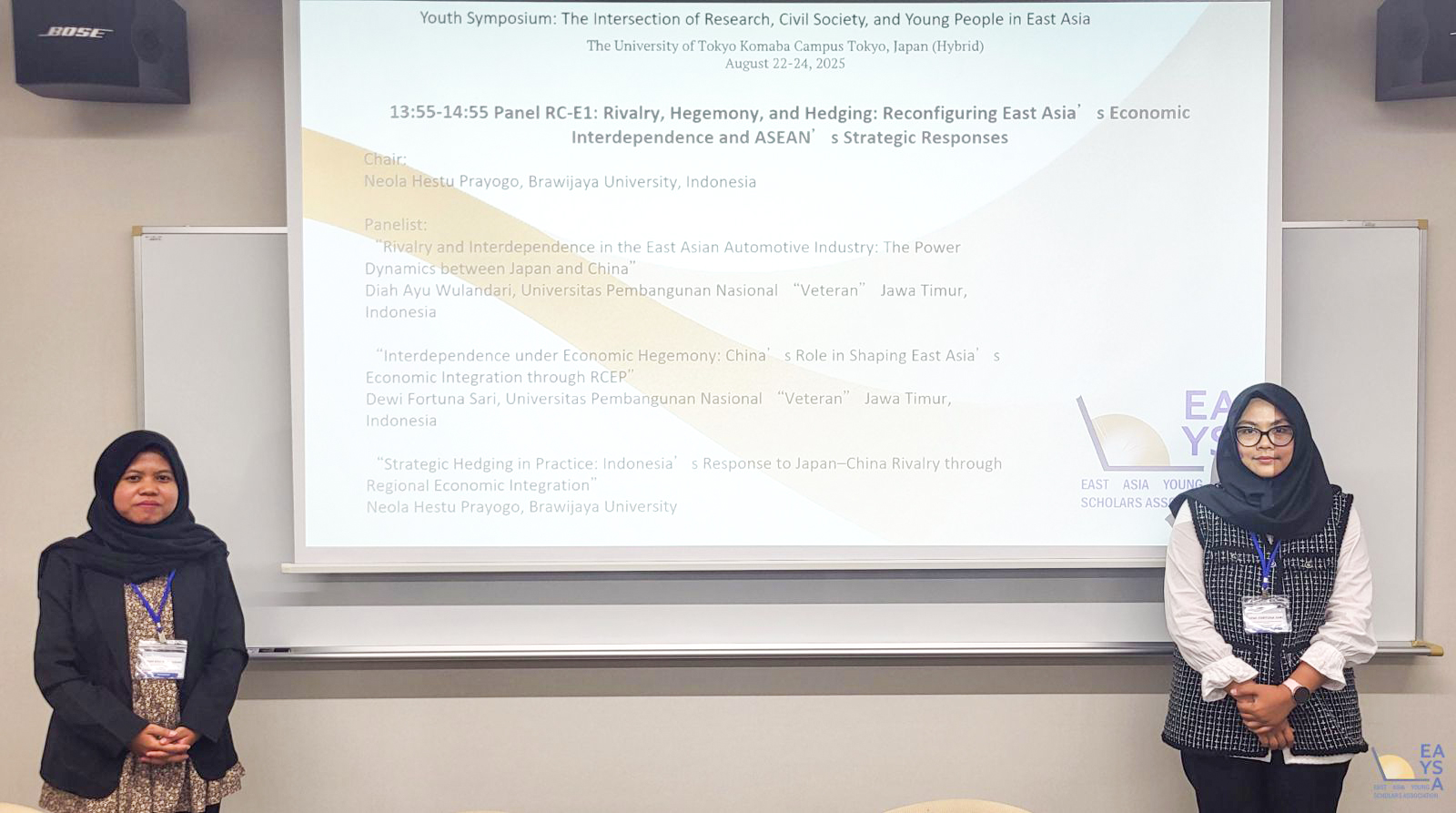Dosen Program Studi Hubungan Internasional, UPN “Veteran” Jawa Timur, Diah Ayu Wulandari, S.Pd., M.A. dan Dewi Fortuna Sari, S.I.P., M.Law. berpartisipasi sebagai presenter dalam The 2025 Youth Symposium: The Intersection of Research, Civil Society, and Young People in East Asia yang diselenggarakan oleh The University of Tokyo pada 22–24 Agustus 2025 di Tokyo, Jepang. Simposium internasional ini menjadi wadah penting bagi para civitas akademika di kawasan Asia untuk mendiskusikan peran riset, masyarakat sipil, dan generasi muda dalam dinamika sosial, politik, dan pembangunan kawasan. Kegiatan ini diikuti oleh civitas akademika dari berbagai universitas serta lembaga terkemuka seperti Harvard College, Amnesty International Japan, The University of Tokyo, Waseda University, Kyushu University, dan berbagai universitas lain guna menciptakan ruang dialog lintas negara yang memperkaya perspektif dan memperkuat jejaring akademik multilateral.