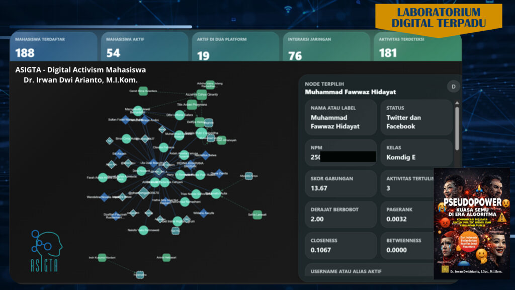 Inovasi ini menempatkan mahasiswa tidak hanya sebagai penerima teori tetapi juga sebagai subjek pembelajaran yang mengalami, mempraktikkan, dan mengevaluasi sendiri aktivitas komunikasinya di ruang digital. Pendekatan tersebut tampak pada pengembangan ASIGTA Aktivisme Mahasiswa di Laboratorium Integrated Digital yaitu sebuah aplikasi pembelajaran yang dirancang untuk mengidentifikasi mahasiswa yang benar-benar melakukan digital activism di Twitter, Facebook atau media sosial lainnya, memvisualisasikan jejaring interaksi multiplatform, serta mengukur posisi aktor melalui pendekatan sentralitas.